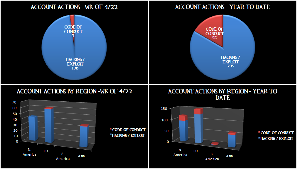 http://www.crimecraft.com/forums/General/topics/Wall-Of-Shame-Updated-4222011">Wall of Shame</a> post in the forums for a graphic showing the number of accounts we ban weekly and year to date by region.